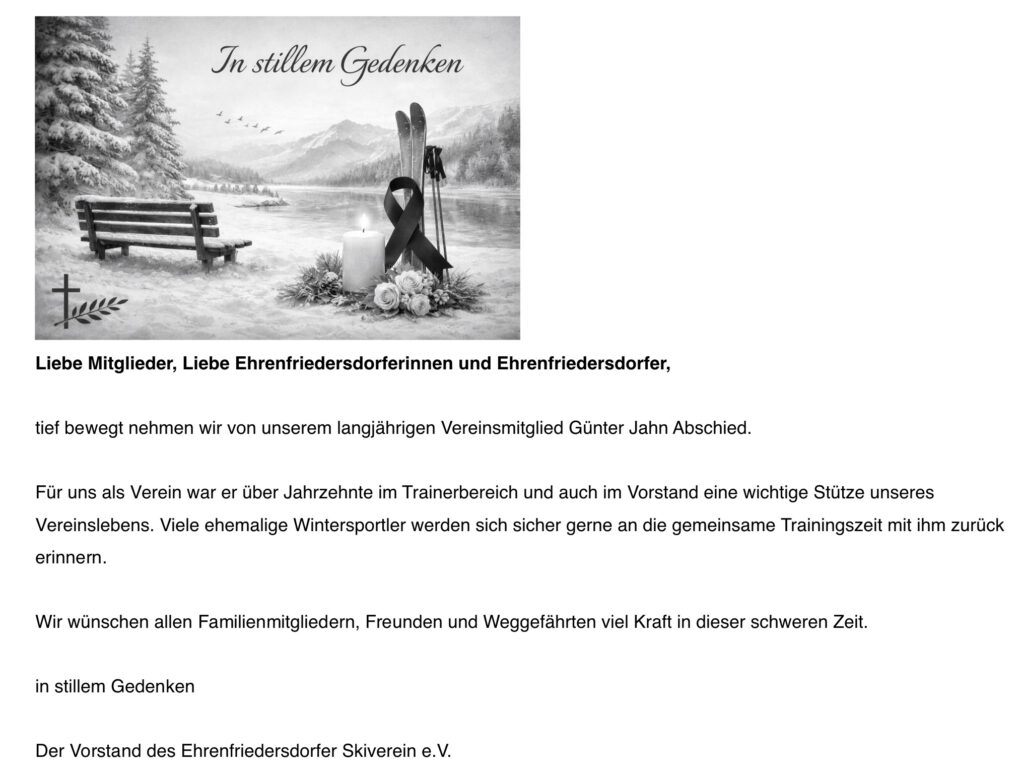 - Artikel 12/2025Liebe Wintersportfreunde, der Ehrenfriedersdorfer Skiverein startet voller Vorfreude in die Wintersaison und hofft auf reichlich Schnee! Bei entsprechender Witterung findet …